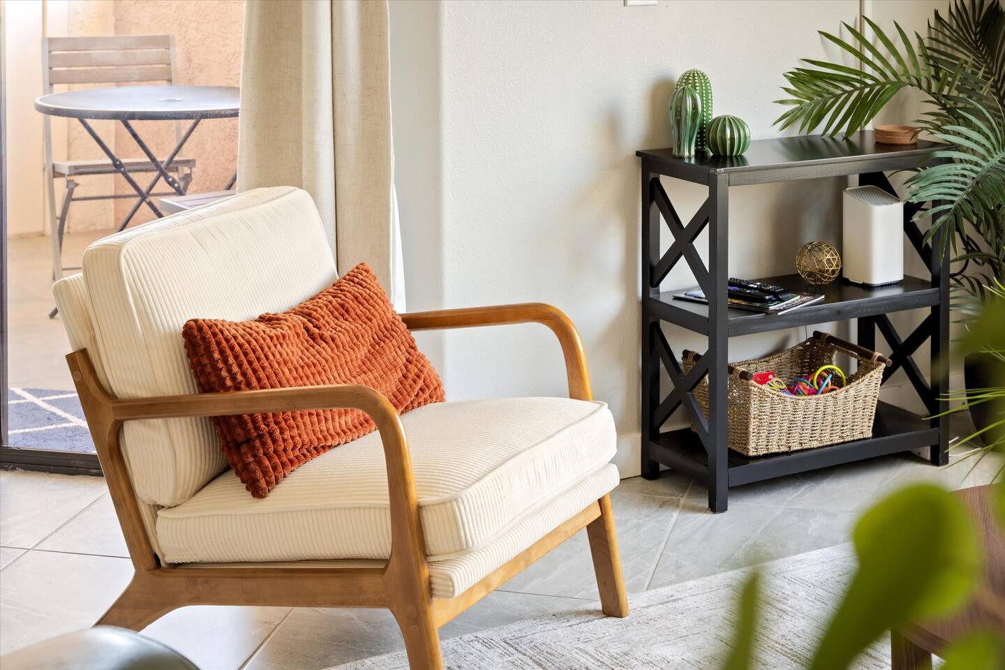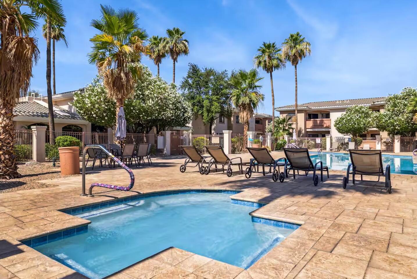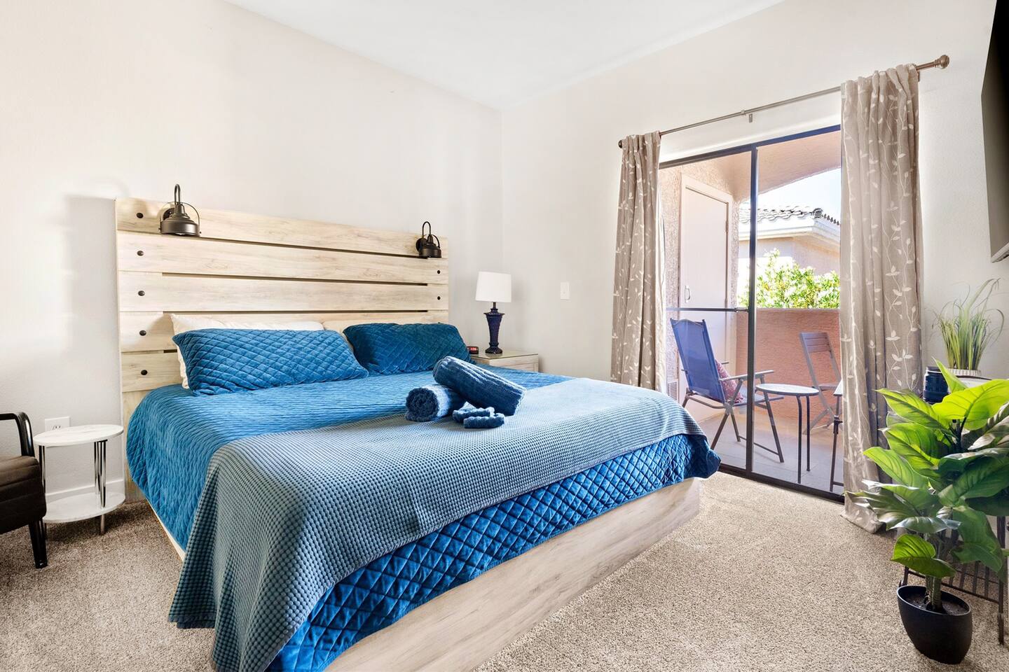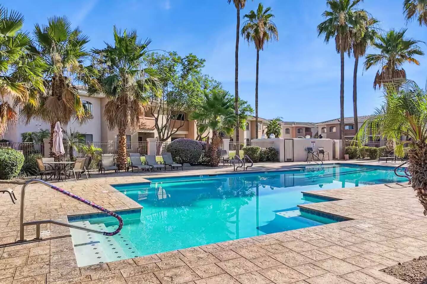 🛋️ Inside our property: Living Room: Step into a bright, open-concept living area with soaring ceilings and arched windows that flood the space with natural light. A plush couch and 65" smart TV create the perfect spot to unwind after a day exploring Phoenix. Sliding glass doors lead to a private balcony—ideal for morning coffee or golden hour lounging. A queen size air mattress with extra bedding is available for extra guests. Kitchen & Dining: The fully equipped kitchen features granite countertops with a breakfast bar, barstools, and all the essentials for cooking at home. Whether you're whipping up a quick breakfast or hosting a cozy dinner, you'll find everything from cookware to wine glasses ready to go. Adjacent to the kitchen is a dining nook with seating for four along with extra chairs for guests. Baby utensils and a folding high chair are also available for our little guests! Primary Bedroom: Your private sanctuary awaits with a king bed, 60" smart TV, walk-in closet, and en-suite bathroom. The spa-inspired bathroom boasts a rainfall shower with pebble flooring, modern fixtures, and plenty of counter space. Soft lighting and blackout curtains ensure restful nights. Second Bedroom: Perfect for additional guests or extra privacy, this bedroom offers a king bed, generous closet space, and easy access to the second full bathroom. Thoughtful touches like bedside lamps, charging stations, and cozy linens make it feel like home. An easy to fold pack 'n play crib is available for your little ones to sleep and play in. Bathrooms: Both bathrooms are full-sized and feature updated vanities, sleek tilework, and hotel-quality towels. The second bathroom includes a tub/shower combo—great for families or longer stays. Laundry Area: A full-sized washer and dryer are tucked into a hallway closet, along with detergent and basic cleaning supplies. Ideal for extended stays or keeping things fresh after a desert hike. Balcony: Your private outdoor space overlooks the quiet interior of the gated community. With seating and shade, it’s a peaceful spot to read, sip, or simply breathe in the Arizona air. Pool, Hot Tub, Gym & BBQ: Guests will have full access to all these resort style amenities. Please note: This property does not have an elevator. The unit is located on the second floor and is accessible via one flight of stairs with a total of 19 steps. Guests should be comfortable using stairs to access the home. Driving Time/Distances from the complex: Phoenix Events Complex: 1.5 miles /5 min Desert West Sports Complex: 3.2 miles /8 min Desert Park West: 3.2 miles /8 min State Farm Stadium : 4.5 miles /10 min Desert Diamond Arena: 4.5 miles /10 min Westgate Entertainment District: 4.6 miles /10 min Desert Diamond Casino: 5.0 miles /12 min Ak-Chin Pavilion: 7.5 miles / 15 min Footprint Center: 13.5 miles /22 min Chase Field: 13.7 miles /22 min Phoenix Sky Harbor International Airport: 18.5 miles /25 min Phoenix Raceway: 19.8 miles /28 min