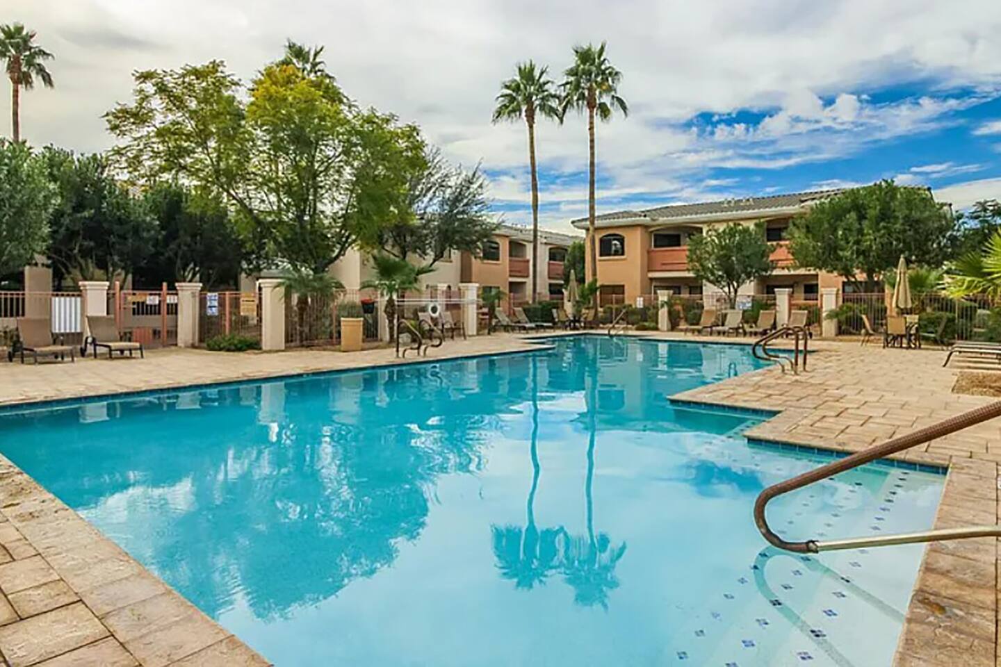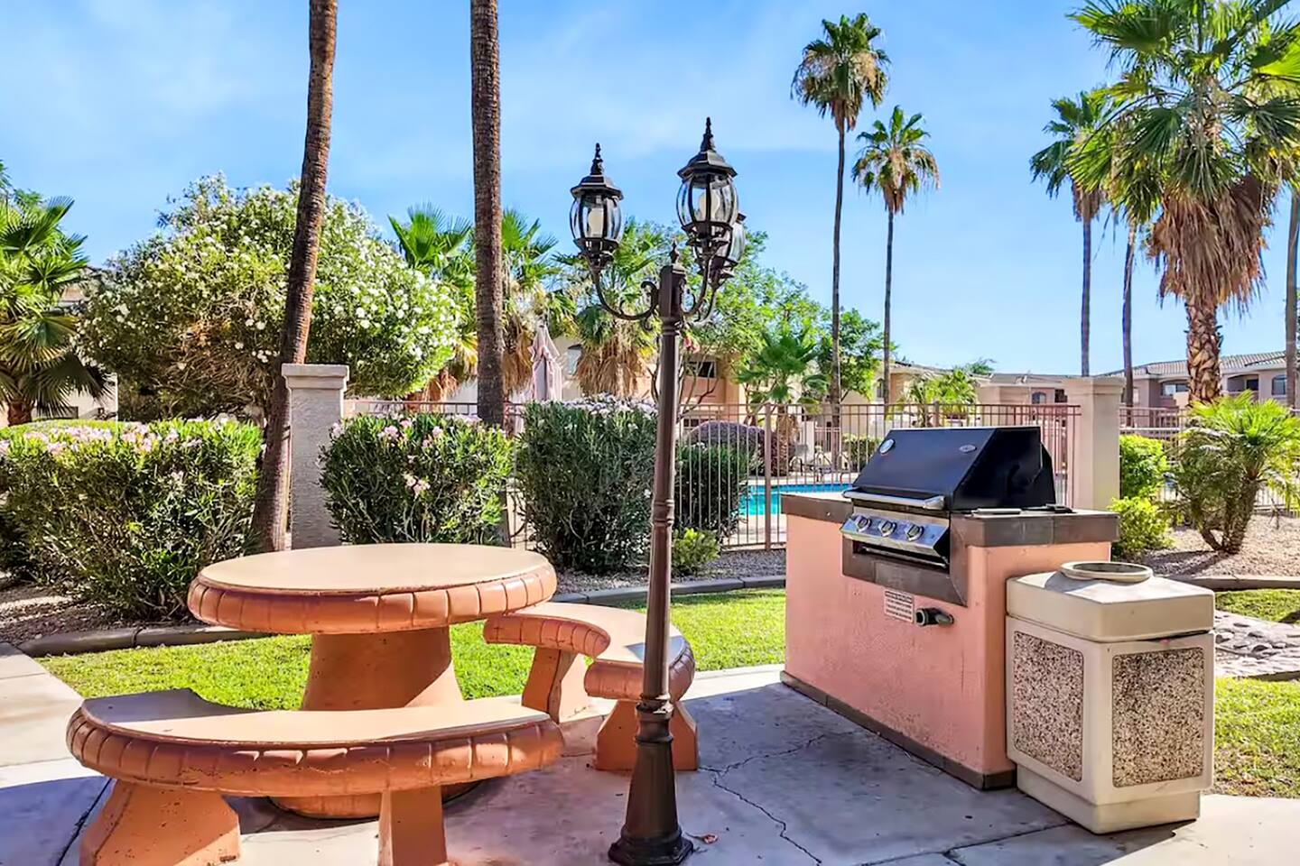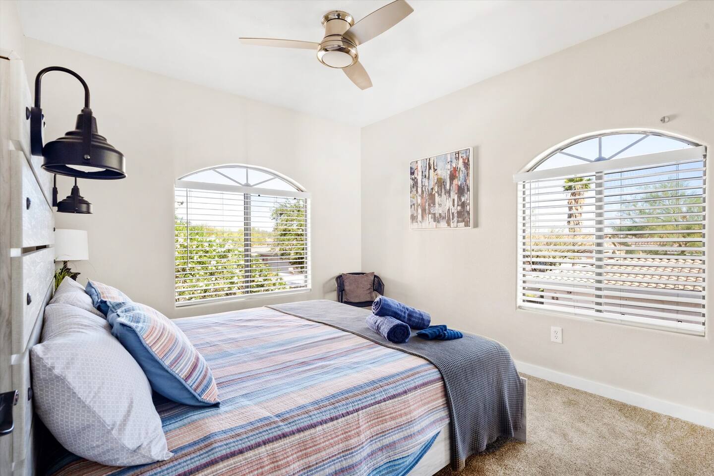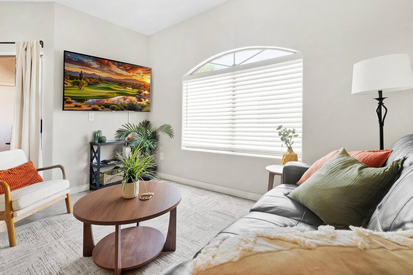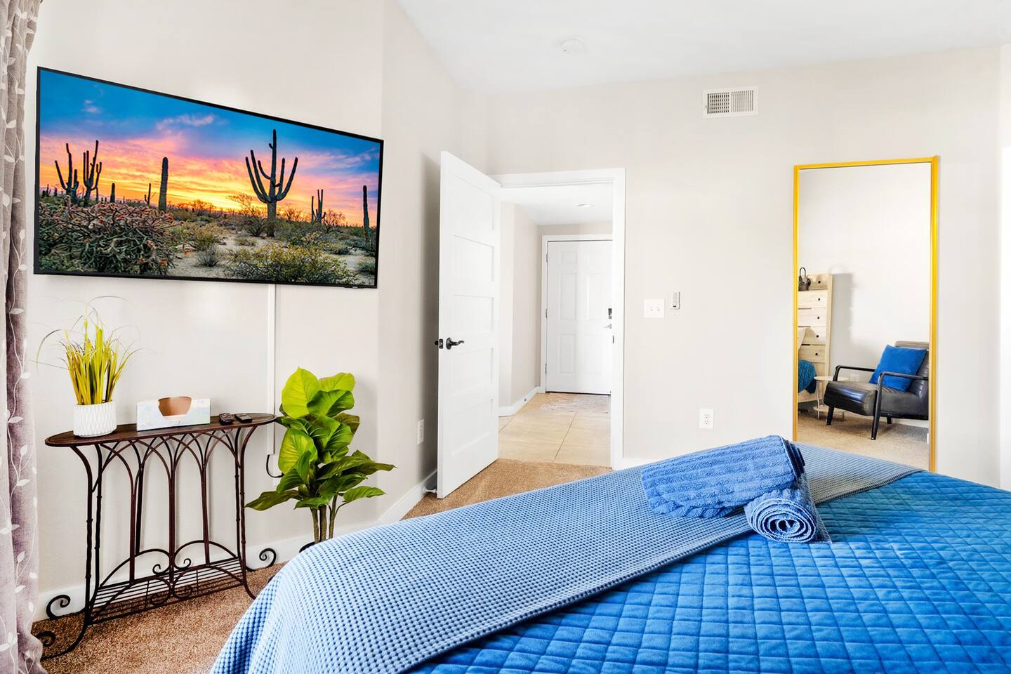 🛋️ Inside our property: Living Room: Step into a bright, open-concept living area with soaring ceilings and arched windows that flood the space with natural light. A plush couch and 65" smart TV create the perfect spot to unwind after a day exploring Phoenix. Sliding glass doors lead to a private balcony—ideal for morning coffee or golden hour lounging. A queen size air mattress with extra bedding is available for extra guests. Kitchen & Dining: The fully equipped kitchen features granite countertops with a breakfast bar, barstools, and all the essentials for cooking at home. Whether you're whipping up a quick breakfast or hosting a cozy dinner, you'll find everything from cookware to wine glasses ready to go. Adjacent to the kitchen is a dining nook with seating for four along with extra chairs for guests. Baby utensils and a folding high chair are also available for our little guests! Primary Bedroom: Your private sanctuary awaits with a king bed, 60" smart TV, walk-in closet, and en-suite bathroom. The spa-inspired bathroom boasts a rainfall shower with pebble flooring, modern fixtures, and plenty of counter space. Soft lighting and blackout curtains ensure restful nights. Second Bedroom: Perfect for additional guests or extra privacy, this bedroom offers a king bed, generous closet space, and easy access to the second full bathroom. Thoughtful touches like bedside lamps, charging stations, and cozy linens make it feel like home. An easy to fold pack 'n play crib is available for your little ones to sleep and play in. Bathrooms: Both bathrooms are full-sized and feature updated vanities, sleek tilework, and hotel-quality towels. The second bathroom includes a tub/shower combo—great for families or longer stays. Laundry Area: A full-sized washer and dryer are tucked into a hallway closet, along with detergent and basic cleaning supplies. Ideal for extended stays or keeping things fresh after a desert hike. Balcony: Your private outdoor space overlooks the quiet interior of the gated community. With seating and shade, it’s a peaceful spot to read, sip, or simply breathe in the Arizona air. Pool, Hot Tub, Gym & BBQ: Guests will have full access to all these resort style amenities. Please note: This property does not have an elevator. The unit is located on the second floor and is accessible via one flight of stairs with a total of 19 steps. Guests should be comfortable using stairs to access the home. Driving Time/Distances from the complex: Phoenix Events Complex: 1.5 miles /5 min Desert West Sports Complex: 3.2 miles /8 min Desert Park West: 3.2 miles /8 min State Farm Stadium : 4.5 miles /10 min Desert Diamond Arena: 4.5 miles /10 min Westgate Entertainment District: 4.6 miles /10 min Desert Diamond Casino: 5.0 miles /12 min Ak-Chin Pavilion: 7.5 miles / 15 min Footprint Center: 13.5 miles /22 min Chase Field: 13.7 miles /22 min Phoenix Sky Harbor International Airport: 18.5 miles /25 min Phoenix Raceway: 19.8 miles /28 min