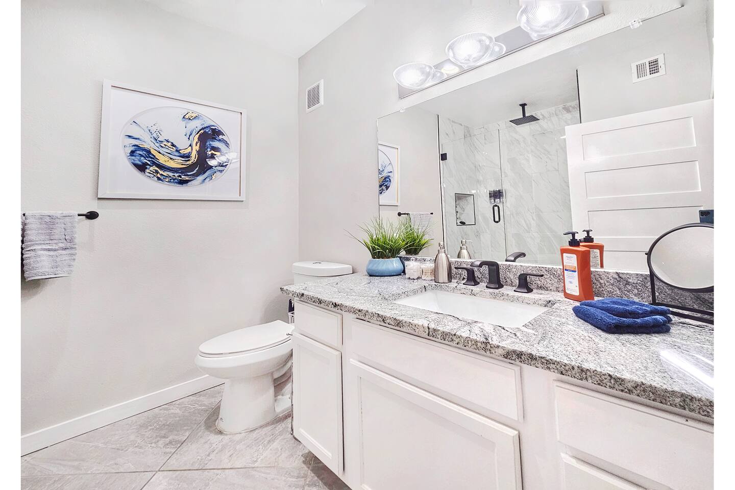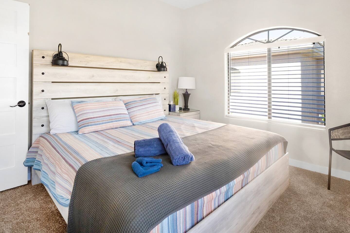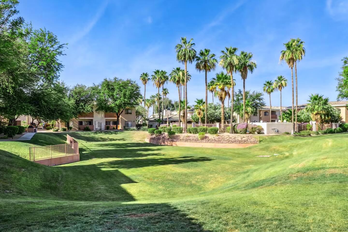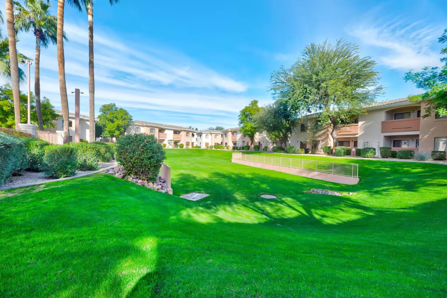 🛋️ Inside our property: Living Room: Step into a bright, open-concept living area with soaring ceilings and arched windows that flood the space with natural light. A plush couch and 65" smart TV create the perfect spot to unwind after a day exploring Phoenix. Sliding glass doors lead to a private balcony—ideal for morning coffee or golden hour lounging. A queen size air mattress with extra bedding is available for extra guests. Kitchen & Dining: The fully equipped kitchen features granite countertops with a breakfast bar, barstools, and all the essentials for cooking at home. Whether you're whipping up a quick breakfast or hosting a cozy dinner, you'll find everything from cookware to wine glasses ready to go. Adjacent to the kitchen is a dining nook with seating for four along with extra chairs for guests. Baby utensils and a folding high chair are also available for our little guests! Primary Bedroom: Your private sanctuary awaits with a king bed, 60" smart TV, walk-in closet, and en-suite bathroom. The spa-inspired bathroom boasts a rainfall shower with pebble flooring, modern fixtures, and plenty of counter space. Soft lighting and blackout curtains ensure restful nights. Second Bedroom: Perfect for additional guests or extra privacy, this bedroom offers a king bed, generous closet space, and easy access to the second full bathroom. Thoughtful touches like bedside lamps, charging stations, and cozy linens make it feel like home. An easy to fold pack 'n play crib is available for your little ones to sleep and play in. Bathrooms: Both bathrooms are full-sized and feature updated vanities, sleek tilework, and hotel-quality towels. The second bathroom includes a tub/shower combo—great for families or longer stays. Laundry Area: A full-sized washer and dryer are tucked into a hallway closet, along with detergent and basic cleaning supplies. Ideal for extended stays or keeping things fresh after a desert hike. Balcony: Your private outdoor space overlooks the quiet interior of the gated community. With seating and shade, it’s a peaceful spot to read, sip, or simply breathe in the Arizona air. Pool, Hot Tub, Gym & BBQ: Guests will have full access to all these resort style amenities. Please note: This property does not have an elevator. The unit is located on the second floor and is accessible via one flight of stairs with a total of 19 steps. Guests should be comfortable using stairs to access the home. Driving Time/Distances from the complex: Phoenix Events Complex: 1.5 miles /5 min Desert West Sports Complex: 3.2 miles /8 min Desert Park West: 3.2 miles /8 min State Farm Stadium : 4.5 miles /10 min Desert Diamond Arena: 4.5 miles /10 min Westgate Entertainment District: 4.6 miles /10 min Desert Diamond Casino: 5.0 miles /12 min Ak-Chin Pavilion: 7.5 miles / 15 min Footprint Center: 13.5 miles /22 min Chase Field: 13.7 miles /22 min Phoenix Sky Harbor International Airport: 18.5 miles /25 min Phoenix Raceway: 19.8 miles /28 min