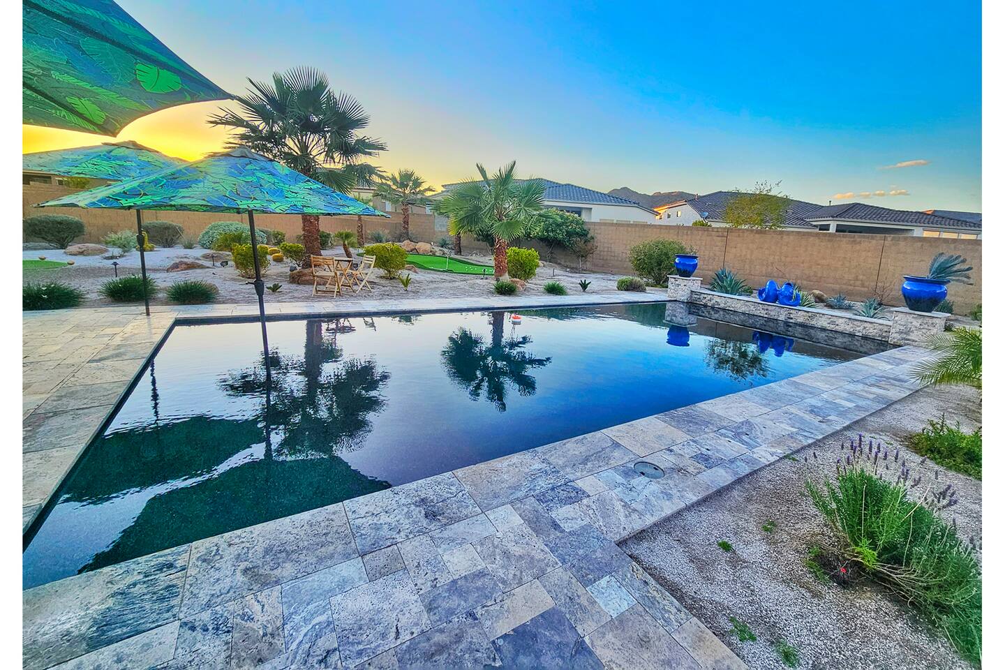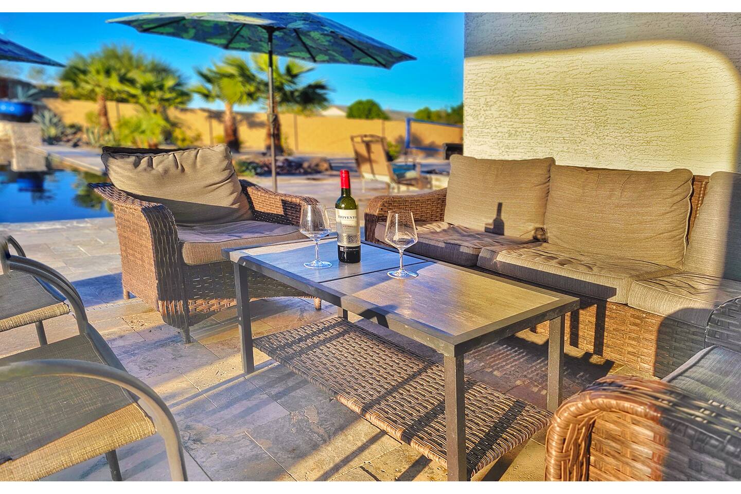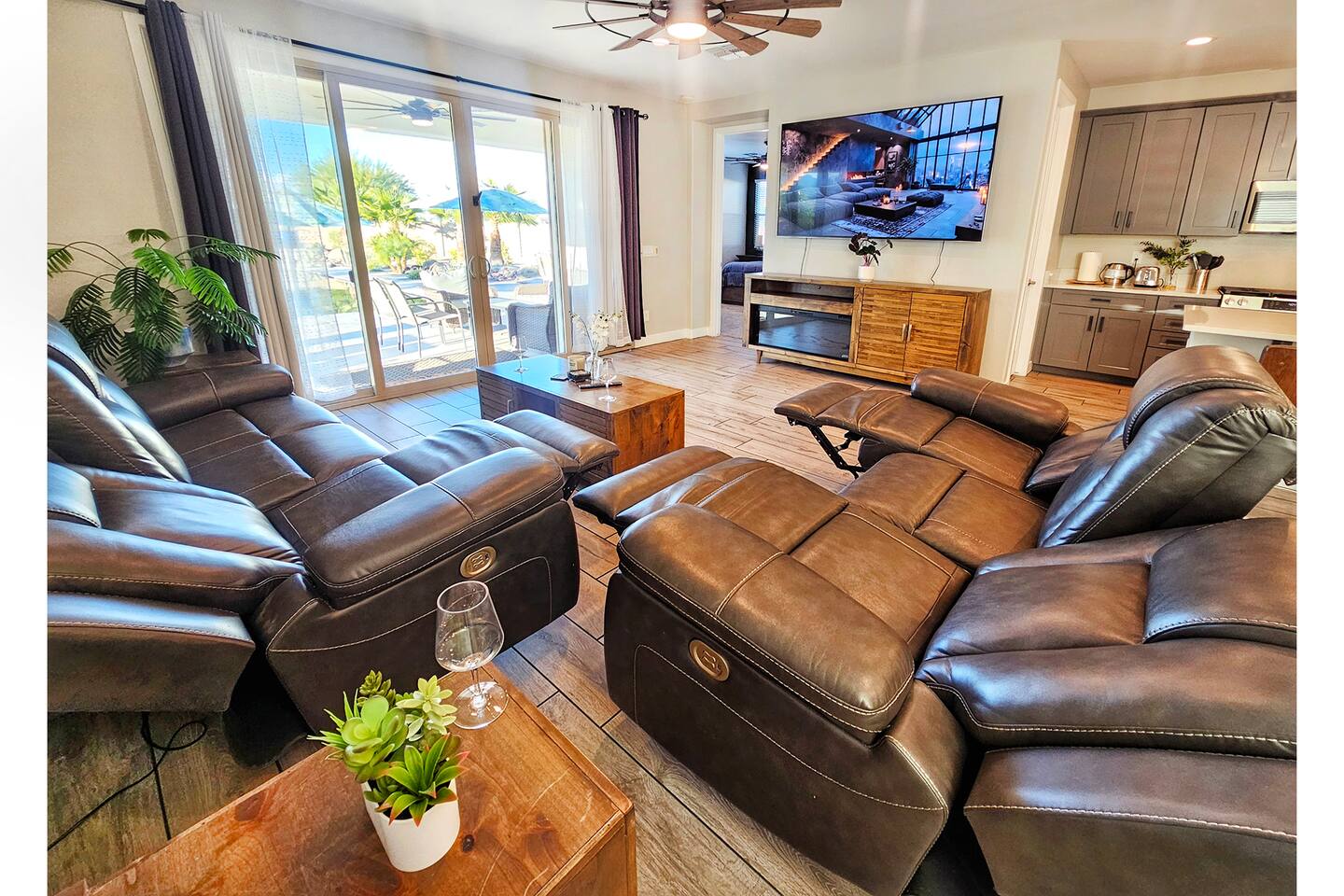 Welcome to a refined modern escape where style and comfort come together seamlessly. This stunning 4-bedroom residence offers a boutique-style vacation experience with high-end finishes, spacious interiors, and your own private heated pool, exclusively for guest use. Perfect for families, groups, golf travelers, and those looking to indulge in a serene Arizona retreat. 🌟 Step Into Luxury From the moment you enter, you’ll be greeted by a bright, open layout designed with sophistication and tranquility in mind. -4 beautifully appointed bedrooms -5 beds (1 king, 2 queens, 1 full, 1 queen plush air mattress). -3 full spa-inspired bathrooms. -Max capacity: Sleeps 10 comfortably. Each bedroom is outfitted with plush mattresses, high-quality linens to ensure a clean and restful night’s sleep. 🏡 Living Spaces The home’s expansive interiors provide multiple areas for relaxation and connection. Enjoy a luxurious living room with dual oversized, fully reclining couches, an 85 inch smart TV, electric fireplace, family games, designer décor, and a modern aesthetic. 🍽️ Chef’s Kitchen & Stylish Dining Prepare gourmet meals, casual breakfasts, or evening cocktails with ease. Enjoy meals indoors at the elegant dining area or step outside for an unforgettable al-fresco dining experience. Kitchen Includes: -Stainless steel appliances -Ample counter space -Fully stocked cookware and essentials -State of the art pasta maker 🌴 Private Heated Pool & Outdoor Paradise Your private backyard oasis awaits. Step outside onto the covered patio and discover your exclusive heated pool, perfect for refreshing morning dips, sun-soaked afternoons, or peaceful evening swims under the Arizona sky. Relax by the fire pit or grill on the BBQ. For recreation, sink putts on the private putting green or play a few rounds of badminton with the family. 🐾 Pet‑Friendly Paradise Traveling with your furry friends? Our home is designed with pets in mind! Enjoy a fully enclosed, spacious backyard perfect for playtime, plus an extra‑large outdoor dog kennel for added comfort. We provide pet bowls for convenience, and welcome up to 2 dogs during your stay. 🌄 Prime Litchfield Park Location Nestled in a peaceful, upscale neighborhood, this home blends luxury and convenience. You’ll be just minutes from: -Championship golf courses -Beautiful desert hiking trails -Local dining, grocery stores, shopping, and family attractions -Westgate Entertainment District -State Farm Stadium Enjoy the serenity of a quiet residential community while staying close to the best of the West Valley. 🏌️♂️Golf Enthusiast’s Getaway Our retreat is perfectly situated for golfers looking to hit the greens! Within minutes of the property, you’ll find some of the West Valley’s most popular public courses: Wigwam Golf Club – 8.9 miles away, offering three championship courses (Gold, Blue, and Red) with resort-style amenities. Palm Valley Golf Club – 10.2 miles away, known for wide fairways and a welcoming layout for all skill levels. Falcon Dunes Golf Course – 9.6 miles away, a scenic links-style course near Luke Air Force Base with White Tank Mountain views. Eagle’s Nest Golf Club (Pebble Creek) – approx. 11 miles away, featuring seven lakes and a beautiful desert setting. Whether you’re here for a quick round or a full golf vacation, these nearby courses make our home the ideal base for your stay!