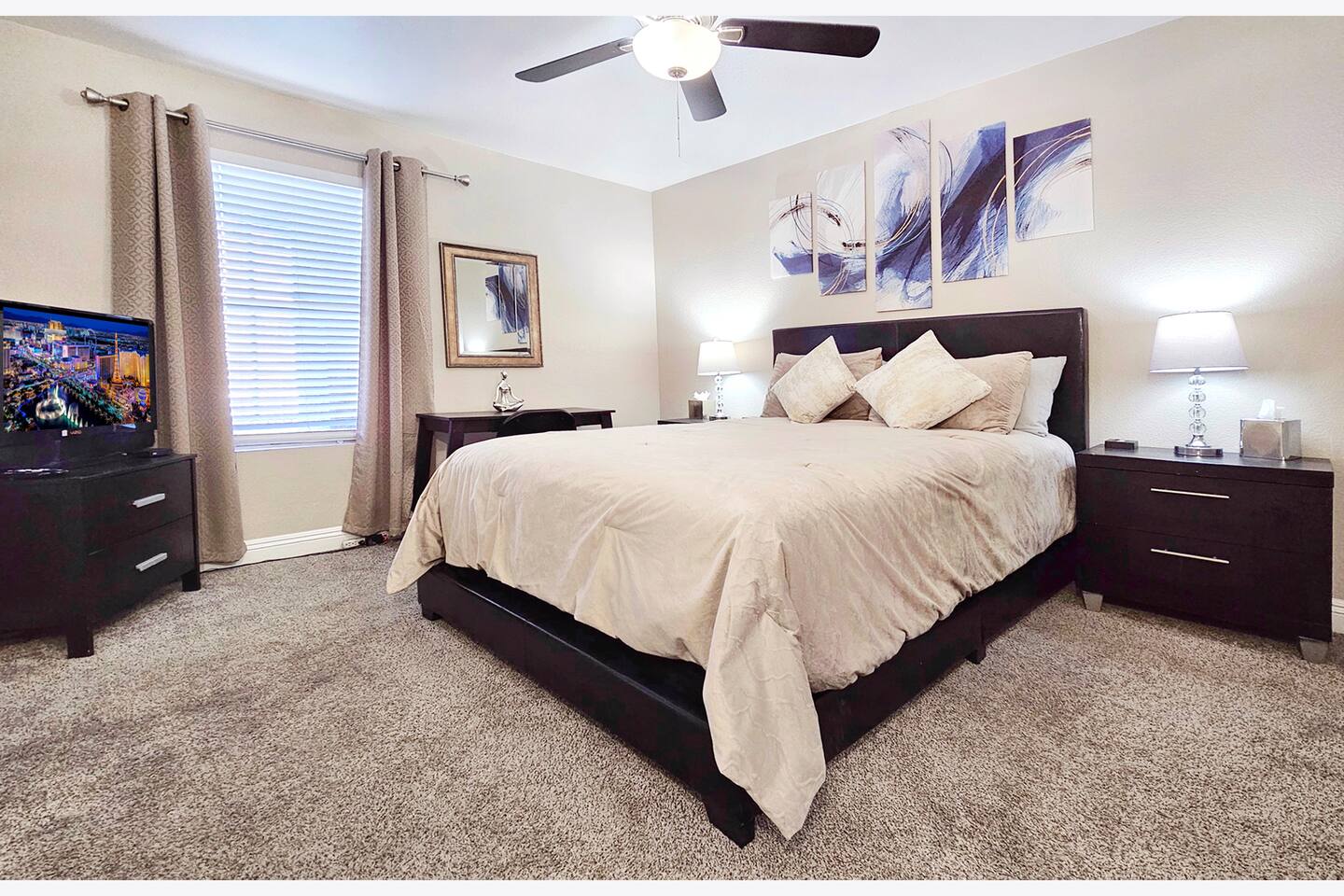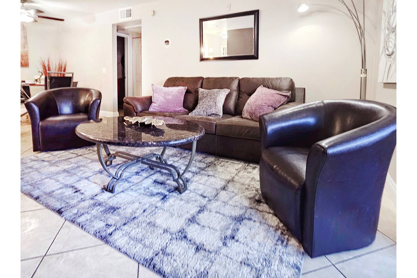 This resort style condo is within walking distance to major casino hotels, 24 hour restaurants and conveniences stores. Just minutes from the Airport, Convention Center, Sporting Arenas and Entertainment Venues. Soak in your own oversized bath tub, relax in the living room or wash your laundry for free inside the unit! This is a ground floor unit so there's no need to lift your heavy luggage up any stairs. You won't find a closer residential complex closer to The Strip than this! Exciting Upgrades are happening here! The brand new Flamingo Shopping & Dining Center is now open. Also, a second Pool AND a new Hot Tub has just been built adjacent to the main pool and is now open! *Sorry, but loud music and parties are prohibited at this residence* If this rental happens to be unavailable the dates you are looking to stay, please click on our profile pictures to search all of our available local listings! Self Check-in Time: Anytime after 4pm and as late as you need to. Early Arrivals: We are unable to allow early check-ins or luggage drops offs before 4pm. If our housekeeper happens to finish early we will notify you that you may check-in as soon as she's finished. You may also check your luggage at the front desk of any major hotel for free. The closest hotel within walking distance of the condo is The Gold Coast and The Rio. Pets: Sorry, but pets are not allowed in this unit. Parking: There is plenty of free parking in the complex directly in front of the Unit guarded by 24 hour security. Parking Trailers/Moving Trucks: Our HOA does not allow Trailers or Moving Trucks of any size to park overnight inside the complex, however, you may park these vehicles next door at The Extended Stay America which is just a 2 minute walk to the condo complex or at the Gold Coast which is a 4 minute walk to the condo complex. Getting Around - Transportation: The preferred method of transportation in Las Vegas is Uber or Lyft, however, buses, shuttles, and taxis are readily available as well. We will provide you with links to download both ride share apps with up to $40 worth of free ride credits when you book your reservation! *The credits will be applied if you are downloading either of the apps to your phone for the first time. Walking Time from Condo (Approx): -3 to 5 minute walk to Bus Stop -5 to 7 min walk to Rio Hotel and Casino -5 to 7 min walk to Palms Hotel and Casino -5 to 7 min walk to Gold Coast Hotel and Casino -15 to 20 min walk to The Strip Driving Time From Condo (Approx): 4 minutes - Center Strip 5 minutes - Raider Stadium 5 minutes - T-mobile Arena 8 minutes - Convention Center 10 minutes - Airport 10 minutes - Downtown Transportation Rates From Condo: -Shuttle to/from Airport. Drop-off/Pick-up at Rio. $11 per person (24 -7) -Bus to/from The Strip. $2 per person (24 - 7) -Uber/Lyft/Taxi to/from Airport/Strip/Convention Center/Downtown $5 - $15 (24 - 7) 2 Bedrooms: -Plush Queen size beds with hypo-allergenic encasements. -Central AC and Heat -Bedside Power Outlets -Spacious Walk-In Closets -Personal Work Desk and Chair -HDTV with Free Cable and WiFi. -Rokus to watch free streaming HDTV. -Additional Drawers and Shelves for storage. -Iron and ironing boards. -Full length mirrors. -Oscillating fans Living Room: -50" HDTV with HDMI connections. -Free Premium Cable TV. -Free Streaming TV in living room (Free access to Netflix, Pandora, YouTube, more). -Brand new spacious couch. -Additional Queen, auto-inflating, plush air mattress. -Extra sheets, pillows and comforter. Dining Area: -Dining Table with 6 chairs available -Complete dining set with plates, silverware, glasses, coffee mugs, etc. 2 Bathrooms: -Showers -Bath Tubs -Toilets -Sinks -Towels -Soaps -Complimentary Toiletries -Hair Dryer Outdoor Patio: -Table and chairs for lounging Kitchen: -Large Oven -Large Microwave -Refrigerator -Freezer -Ice Trays -Brita Filtered Water Pitcher -Coffee maker -Tea Kettle -Toaster -Dishes, glasses, and Utensils -Pots, Pans, Cooking Utensils -Cooking Spices and Condiments
